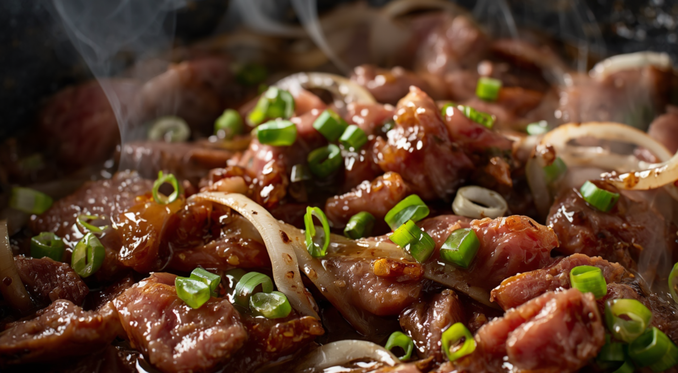 - In a skillet over high heat, combine beef, sliced onion, scallions, soy sauce, mirin, sugar and 1 cup of reserved dashi.
